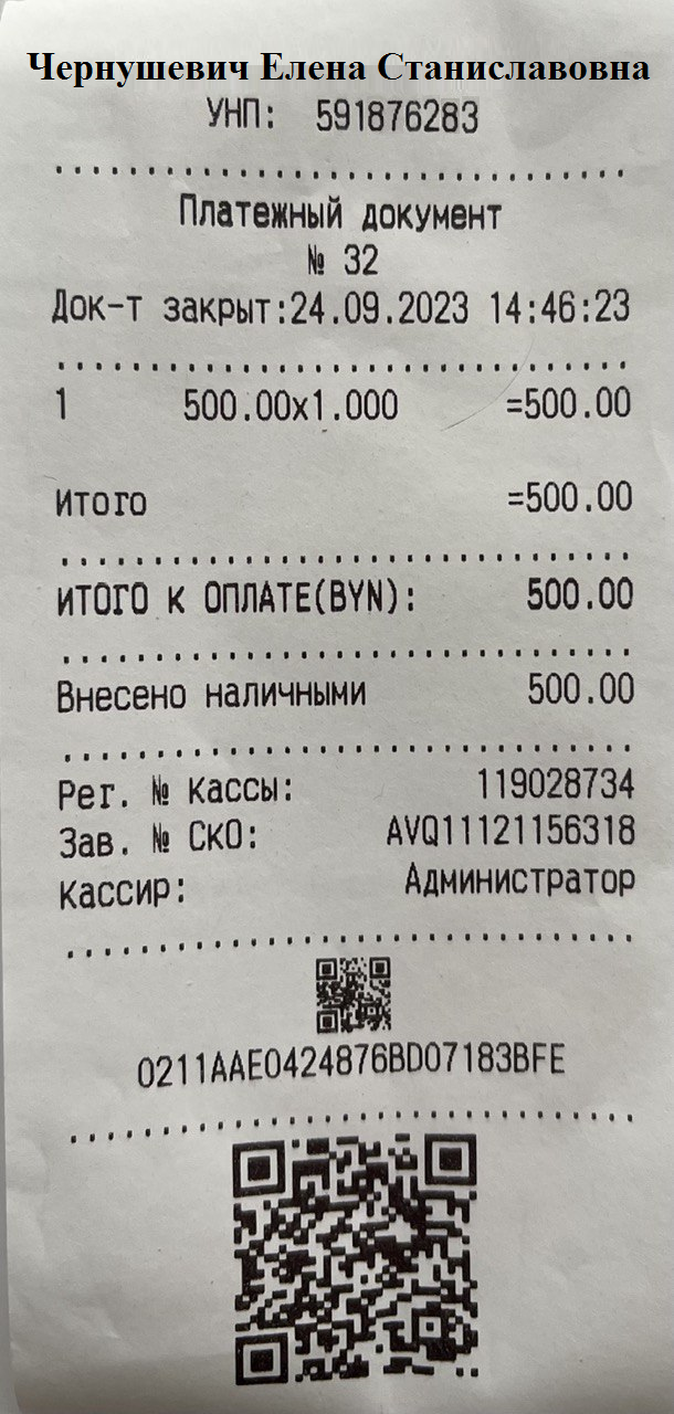 В случае самовывоза или при доставке курьером Вы можете оплатить заказ наличными с получением кассового чека (образец прикреплен ниже).